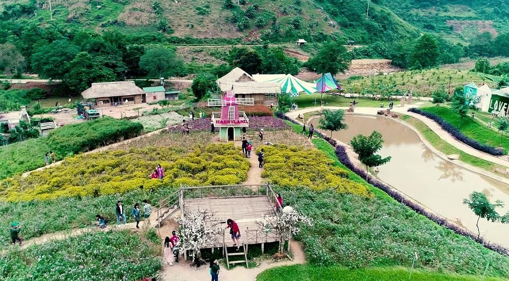 - Vườn hoa Happy land - Happy land có diện tích gần 5ha, nằm giữa một thung lũng rộng lớn ở bản Lùn, xã Mường Sang. Đến đây, du khách sẽ được đón chào bởi những thảm hoa được trồng từ nhiều loại hoa khác nhau, trong đó có những loài hoa đặc trưng của vùng Tây Bắc).