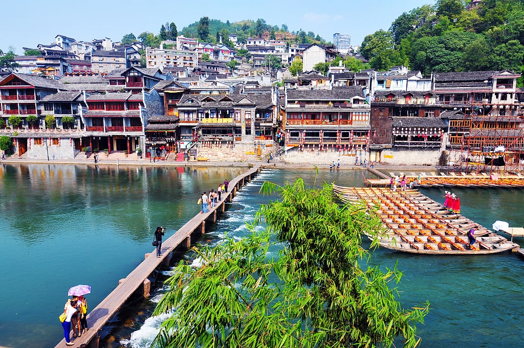 - Cầu Đá Nhảy đặc biệt này được tạo nên nhờ các ụ đá xếp cách nhau. Là địa điểm được yêu thương nhất trong các bức hình của du khách. Ra đời từ năm Khang Hy thứ 43 (1704), vượt qua bao trận lũ cuốn, thăng trầm lịch sử và binh biến loạn lạc, đến nay cây cầu vẫn trường tồn đẹp đẽ như một phần không thể thiếu trong bức tranh lịch sử mang dấu ấn Phượng Hoàng cổ trấn.