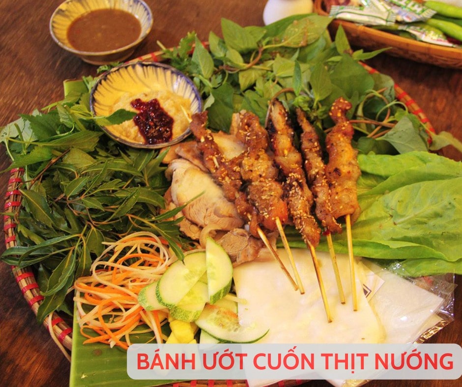 Một phần bánh ướt cuốn thịt nướng đầy đủ bao gồm thịt xiên nướng cháy cạnh có rắc chút đậu phộng, bánh ướt, rau sống và nước chấm mặn ngọt. Món này được bán nhiều ở các quầy hàng rong cạnh bờ sông Hoài, “gây thương nhớ” cho đông đảo du khách lẫn người dân địa phương.
