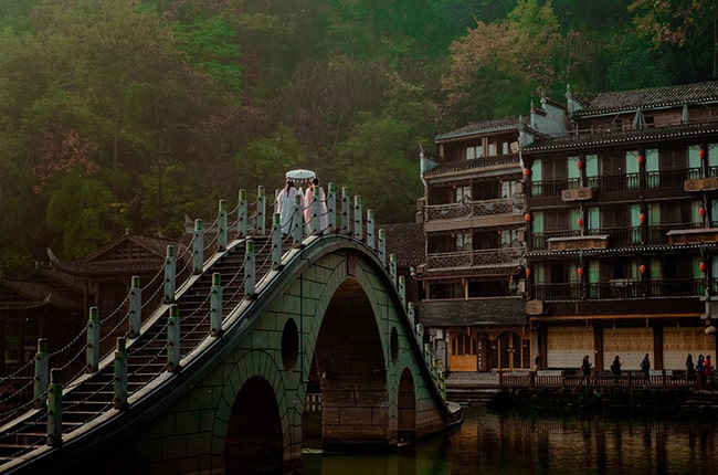 - Cầu Đá Nhảy đặc biệt này được tạo nên nhờ các ụ đá xếp cách nhau. Là địa điểm được yêu thương nhất trong các bức hình của du khách. Ra đời từ năm Khang Hy thứ 43 (1704), vượt qua bao trận lũ cuốn, thăng trầm lịch sử và binh biến loạn lạc, đến nay cây cầu vẫn trường tồn đẹp đẽ như một phần không thể thiếu trong bức tranh lịch sử mang dấu ấn Phượng Hoàng cổ trấn.