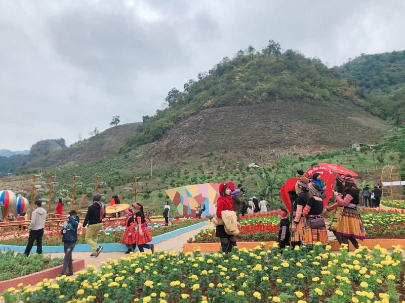 - Vườn hoa Happy land - Happy land có diện tích gần 5ha, nằm giữa một thung lũng rộng lớn ở bản Lùn, xã Mường Sang. Đến đây, du khách sẽ được đón chào bởi những thảm hoa được trồng từ nhiều loại hoa khác nhau, trong đó có những loài hoa đặc trưng của vùng Tây Bắc).