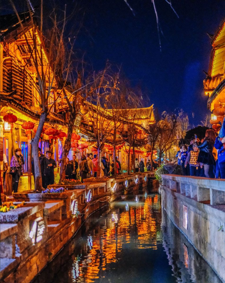 Về đêm khi màu đen của bóng tối dần xuống trên những mái nhà, Cổ Trấn Trung Hoa lại lung linh trong những ánh đèn hiện đại đầy màu sắc, nhộn nhịp sôi động bởi các hoạt động mua bán ăn uống tại đây.